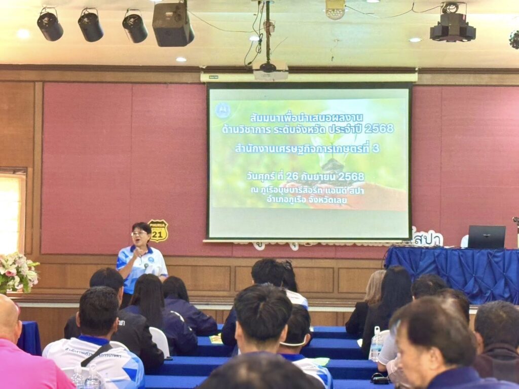 วันที่ 26 กันยายน 2568 นางอุษา โทณผลิน ผอ.สศท.3 มอบหมายให้ นางอาทิตยา ดวงจันทา ผู้อำนวยการส่วนแผนพัฒนาเขตเศรษฐกิจการเกษตร (ผอ.สผศ.) และเจ้าหน้าที่ สผศ. เป็นเจ้าภาพ จัดการสัมมนาเพื่อนำเสนอผลงานทางวิชาการระดับจังหวัด ประจำปีงบประมาณ 2568 ของสำนักงานเศรษฐกิจการเกษตรที่ 3 ณ ภูเรือบุษบารีสอร์ท แอนด์ สปา อำเภอภูเรือ จังหวัดเลย