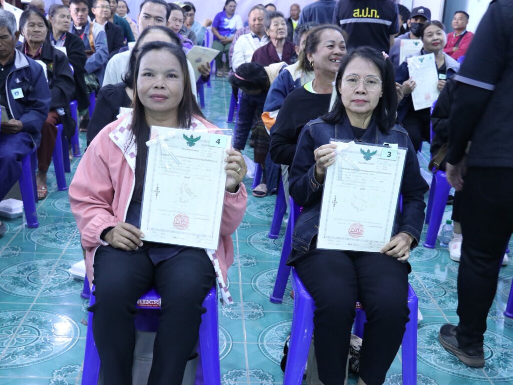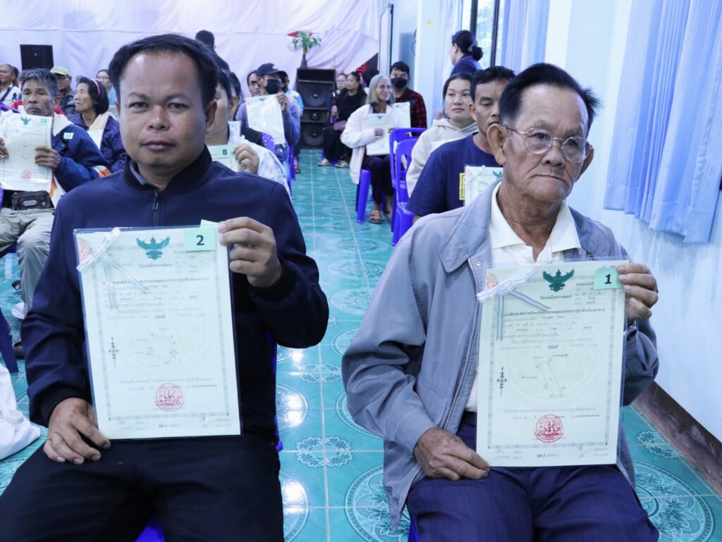 In Udon Thani Province, the ceremony was honored by the presence of Mr. Nattapong Khamwongpin, Deputy Governor of Udon Thani, who chaired the provincial event. The program included the placement of an official notice requiring landholders to enter the land reform process, covering a total of 332 rai, and the distribution of 50 Agricultural Land Title Deeds to eligible farmers in a fair and transparent manner. This initiative aligns with government policies and the objectives of ALRO to address unlawful land occupation and reallocate land to landless farmers. The activity was held at Ban Na Dee, Village No. 7, Nakham Subdistrict, and at the Nakham Subdistrict Administrative Organization, Ban Dung District, Udon Thani Province. The event was attended by heads of government agencies, officials from the Ministry of Agriculture and Cooperatives, local administrative organizations, as well as village headmen and community leaders who joined the Kick-Off event in unity.