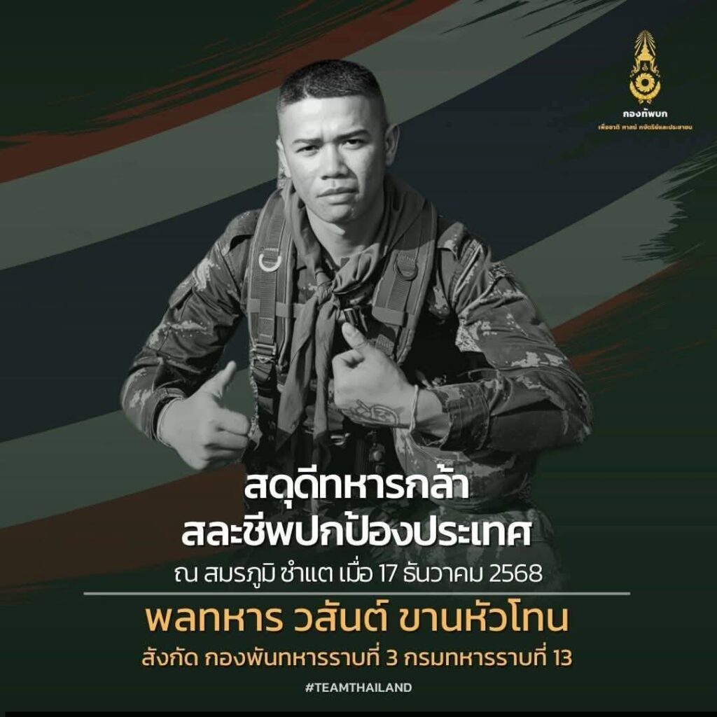 December 19, 2025 – Personnel from the Regional Agricultural Economy Office 3 (ROAE 3) gathered to wave the Thai national flag as a solemn tribute to the bravery and sacrifice of Private Wasan Khanhuathone (widely known as Private Esso). Private Wasan, a dedicated soldier from the Chao Phraya Surawong Watthanasak Camp, heroically laid down his life in the line of duty while stationed at the Sam Tae Operational Base in Kantharalak District, Si Sa Ket Province. This gesture by RAEO 3 serves to recognize his ultimate sacrifice for the sovereignty and peace of the nation.