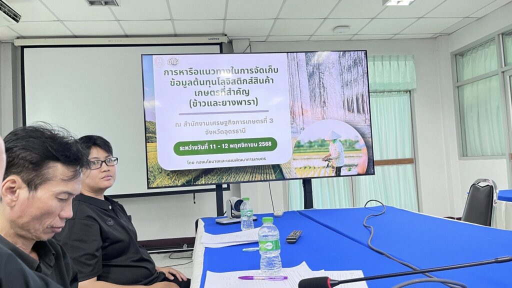 On November 11–12, 2025, the Office of Agricultural Economics Region 3 (OAE Region 3), Udon Thani, led by Ms. Pawalisa Sirikul, Acting Director of OAE Region 3, together with Mrs. Athittaya Duangchanta, Director of the Agricultural Economics Zone Development Planning Division (AEZDPD), and officers from the Planning Section, participated in a meeting and knowledge-sharing session on the Development of a Logistics Cost Database for Key Agricultural Commodities (White Rice and Natural Rubber).