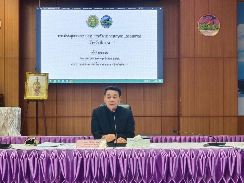 The meeting was held at the Sirindhorn Wanlee Conference Room, 4th Floor, Bueng Kan Provincial Hall, Mueang District, Bueng Kan Province. Mr. Nakhon Siripanyanan, Deputy Governor of Bueng Kan Province, presided over the meeting on behalf of the Governor of Bueng Kan Province. The purpose of the meeting was to jointly consider the preparation of a monthly provincial agricultural product calendar for food and nutrition security management in 2025. During the meeting, Ms. Narinpat Lakapunrat presented the Gross Provincial Product (GPP) of Bueng Kan Province for the third quarter of 2025 and the outlook for the entire year, as well as approaches for developing organic agriculture for agro-tourism. This information was presented for the committee’s acknowledgement and for relevant agencies to utilize accordingly.