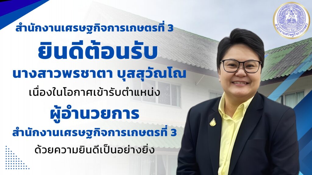 ข่าวประชาสัมพันธ์สำนักงานเศรษฐกิจการเกษตรที่ 3 จังหวัดอุดรธานี (สศท.3) ขอแสดงความยินดีและให้การต้อนรับ #นางสาวพรชาตา_บุสสุวัณโณ ในโอกาสเข้ารับตำแหน่ง ผู้อำนวยการสำนักงานเศรษฐกิจการเกษตรที่ 3 อย่างเป็นทางการ / 9 ธันวาคม, 2025 วันจันทร์ที่ 8 ธันวา